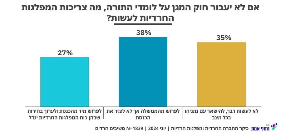 - 38% מהחרדים סבורים כי על הנציגים החרדים לפרוש מהממשלה, אך לא לפזר את הכנסת.