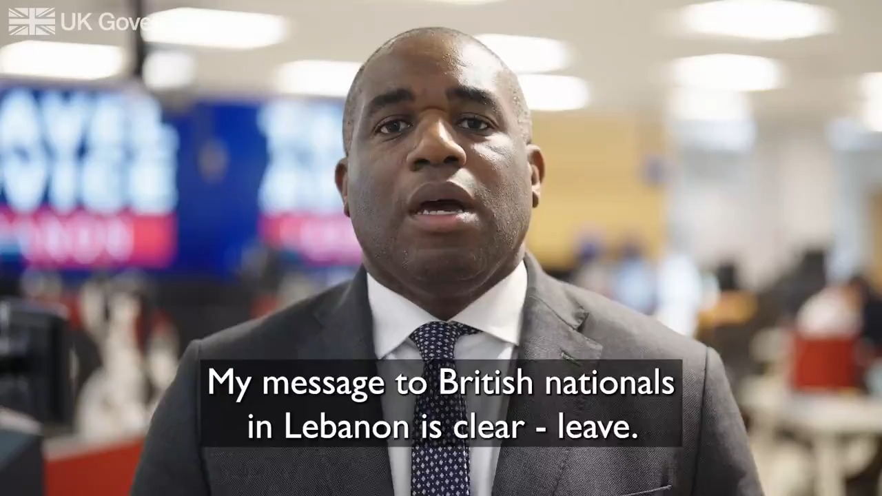 13:19: שר החוץ החדש של בריטניה דיוויד לאמי מודיע לאזרחי בריטניה בלבנון: "עליכם לעזוב".