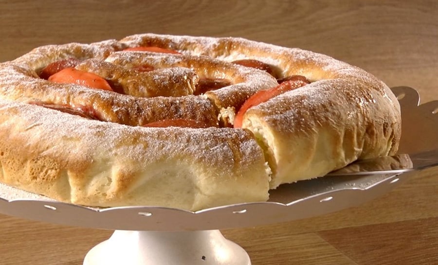10. אופים בתנור שחומם מראש ל-180 מעלות במשך כ-30 דקות או עד שהמאפה מזהיב. מברישים את המאפה בשאר זיגוג הריבה, מצננים ומגישים עם מעט אבקת סוכר מעל.