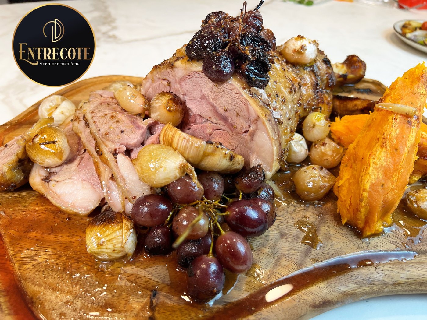 אופן ההגשה: לאחר הצלייה, מוציאים את הבשר מהתנור, נותנים לו לנוח במשך 30 דקות ואז פורסים על קרש חיתוך, מפזרים סביבו את השאלוט, השום, הענבים והבטטות, יוצקים מעל מנוזלי התבנית ומגישים.