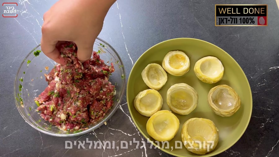 1. בקערה גדולה, מערבבים לעיסה אחידה את הבשר, הבצל, הכוסברה, הביצה, פירורי הלחם, תערובת התבלינים, מלח ופלפל שחור. יוצרים מהעיסה 8-12 קציצות בגודל שיתאים לקוטר של תחתיות הארטישוק וממלאים כל תחתית בקציצת בשר.