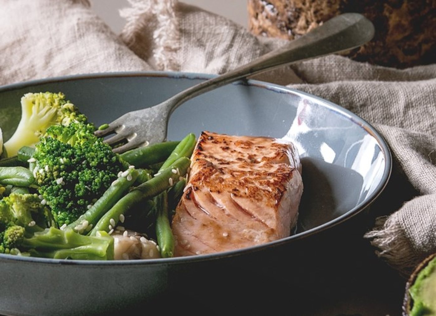 4. מוציאים את התבנית מהתנור, מסיטים את הברוקולי לצידי התבנית ומניחים את נתחי הסלמון במרכז. אופים במשך 10-12 דקות ומוציאים מהתנור.