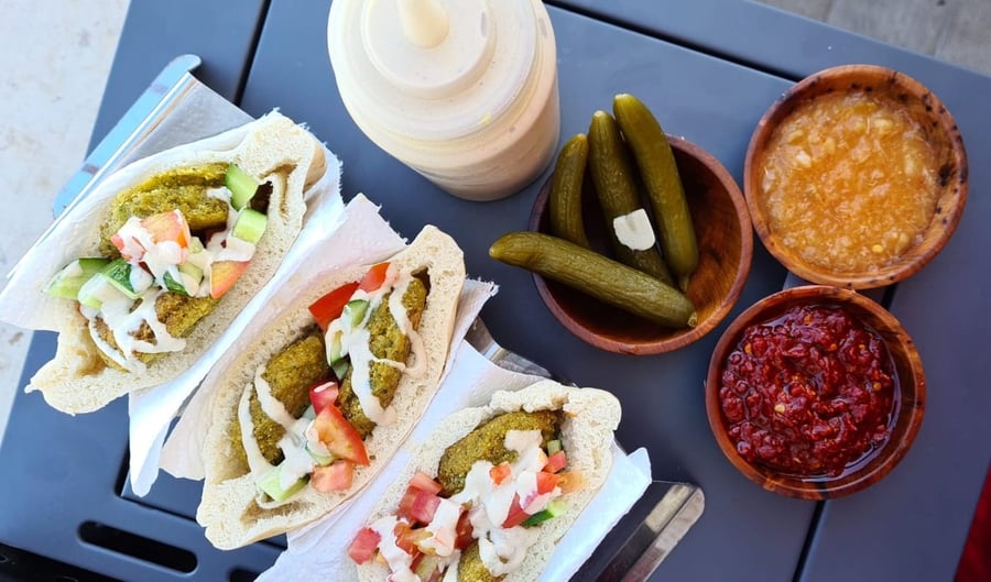 מגישים בחצאי פיתות עם סלט קצוץ, חמוצים, טחינה, חומוס, חריף וכל תוספת אהובה אחרת.