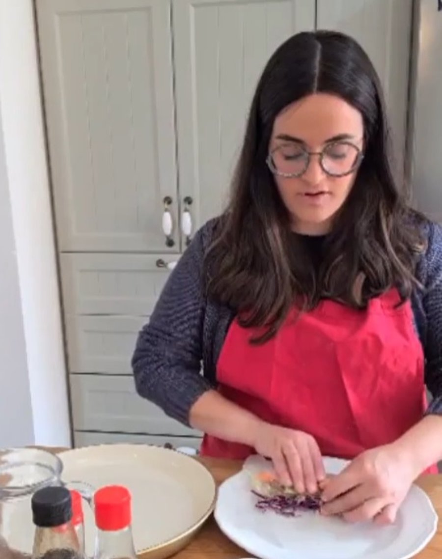 3. אוחזים בקצה הדף שקרוב אלינו ומגלגלים אותו פנימה גלגול אחד, עם כל רכיבי המילוי, ואז מקפלים פנימה את שני צידי הדף, סוגרים בגלגול ומהדקים היטב. חוזרים על הפעולה עד שכל הרולים מוכנים.
