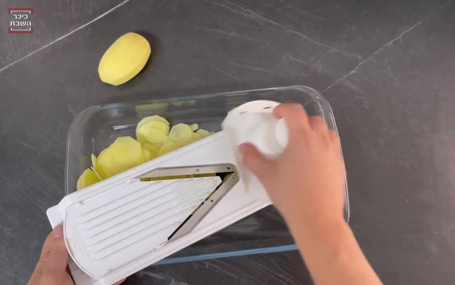 1. בעזרת מנדולינה או סכין חדה מאוד, פורסים את תפוחי האדמה לפרוסות דקות מאוד (כמו חטיף צ'יפס) ומניחים את הפרוסות בקערה או תבנית גדולה.