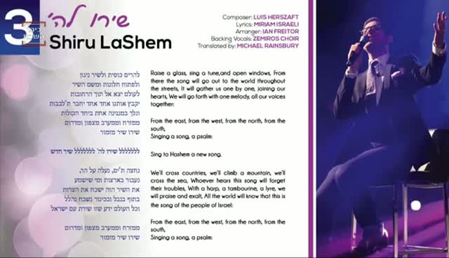 להנאתכם מצורף השיר "שירו לה'" מתוך האלבום. לחן: לואיס הרצאפט, מילים: מרים ישראלי, עיבוד: איאן פרייטור, קולות: מקהלת זמירות.
