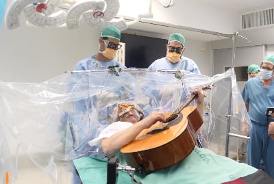 חולה פרקינסון, ניגן הבוקר בגיטרה שלו מחרוזת לחג פורים, בזמן שעבר בבית חולים איכילוב ניתוח מוח להשתלת קוצב DBS- לשיפור הרעד שסבל ממנו • צפו בתיעוד וידאו (מעניין)