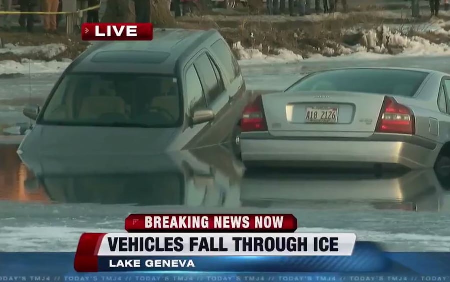 כך קרה באגם ג'נבה בוויסקונסין, ארה"ב, כאשר כ-20 רכבים טבעו באגם לאחר שהקרח החל להפשיר. כוחות הכיבוי שהגיעו למקום הצליחו למשות את הרכבים ובמזל גדול לא היו נפגעים באירוע.