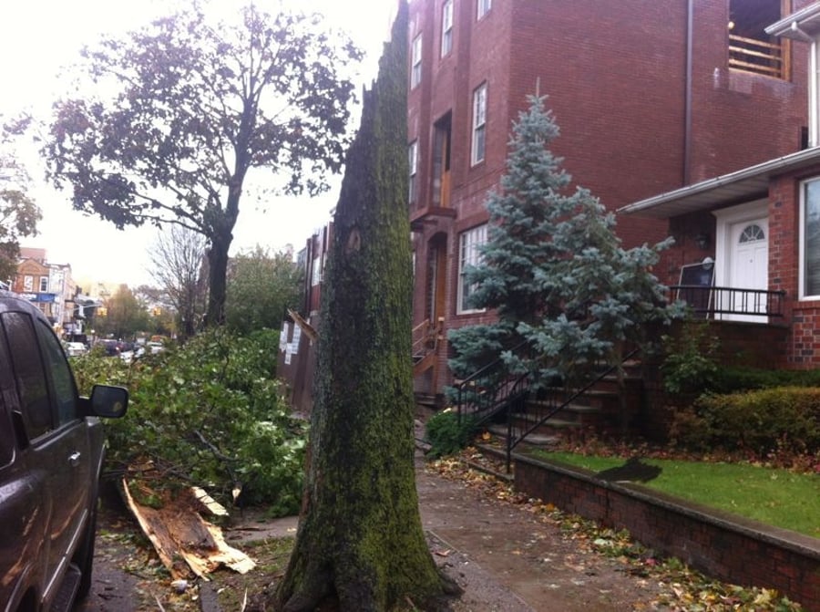 הבוקר שאחרי הסופה "סנדי": מתפללי בית הכנסת שהגיעו הבוקר (שלישי) לתפילת שחרית בבית הכנסת המרכזי בברוקלין, "שערי ציון", נדהמו לגלות עץ גדול ממדים שקרס בסמוך לבית הכנסת הגדול כאשר חלקו אף פגע במבנה בית הכנסת.