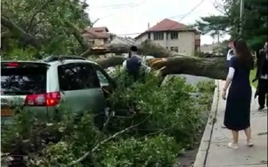 נס במונסי: חרדי שחילק חלות לנזקקים ניצל, לאחר שעץ כבד נפל על רכבו ומחץ אותו.