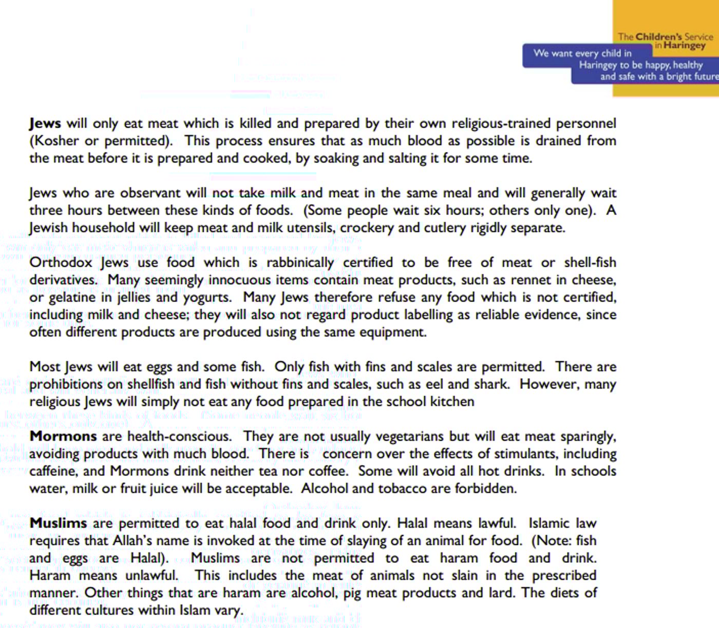 המועצה הבריטית כותבת: "לאנשים מאמינים יש דרישות תזונתיות ספציפיות. ולכן, צריכים בתי הספר להתאים את הצרכים הללו על מנת להבטיח כי התלמידים והצוות המשתייכים לקבוצות דתיות, יוכלו לשמור על בריאות, וגם לא להתפשר על איסורים מחמת אמונתם".