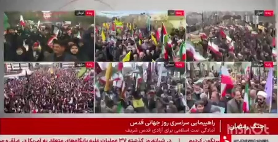 בתיעוד נוסף שפורסם, רואים פטריית עשן כתוצאה מתקיפה ישראלית בטהרן בזמן צעדת 'יום אל קודס'. הנוכחים פוצחים בקריאות: "אללה אכבר".