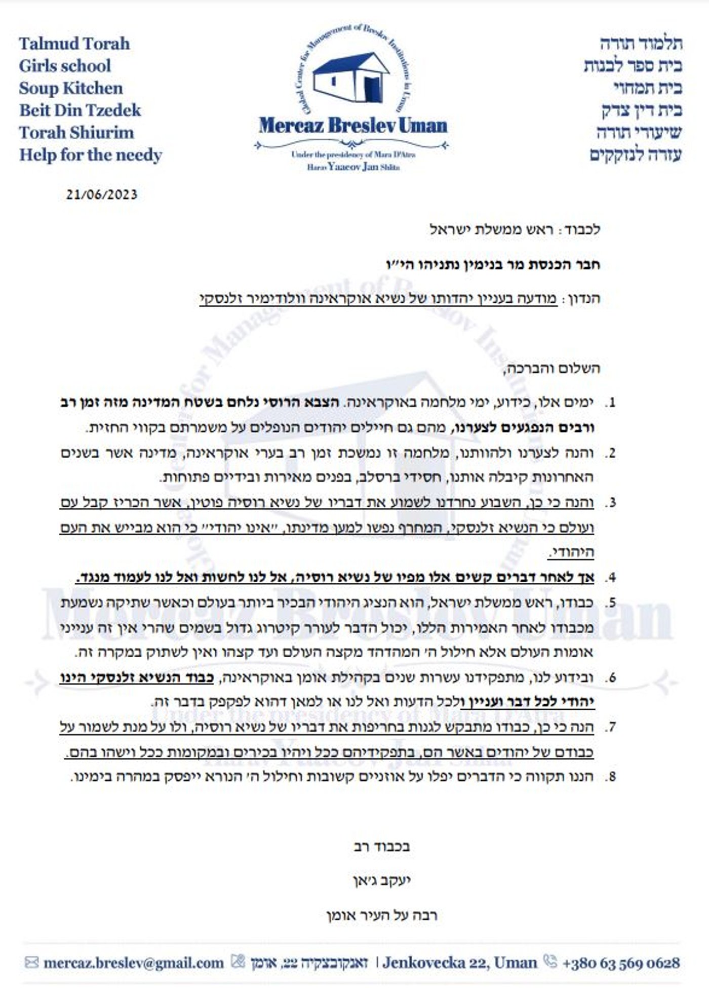 "והנה לצערנו ולהוותנו", כותב הרב ג'אן לראש הממשלה, "מלחמה זו נמשכת זמן רב בערי אוקראינה, מדינה אשר בשנים האחרונות קיבלה אותנו, חסידי ברסלב, בפנים מאירות ובידיים פתוחות. והנה כי כן, השבוע נחרדנו לשמוע את דבריו של נשיא רוסיה פוטין".