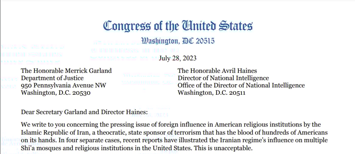 נציג בית הנבחרים של ארה"ב ששלח את המכתב אמר ל'פוקס ניוז': "ניסיונותיו של המשטר האיראני להפיץ השפעה מרושעת בארה"ב במספר מסגדים ומרכזי תרבות שיעים ברחבי המדינה מתרחשים כבר שנים".