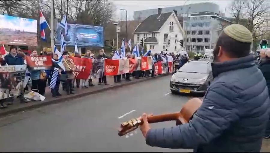 למעלה ממאה תומכי ישראל מפגינים בשעה זו מול בית הדין הבינ״ל בהאג, כשהם נושאים בידם שלטים עם תמונותיהם של החטופים תוך שירת ״עם ישראל חי״.