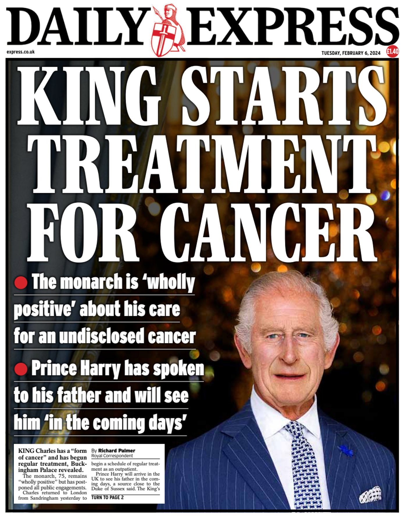 בכותרת הראשית של עיתון ה'טיימס' הבריטי נכתב: "למלך יש סרטן". מילים כדורבנות שמספיקות כדי לזעזע כל בריטי ממוצע. בהמשך נכתב בכותרת המשנה כי המלך נשאר אופטימי ושיורש העצר וויליאם צפוי לקחת על עצמו יותר תפקידים בעתיד הקרוב. גם דבר נסיעתו של הארי לאנגליה הוזכר בכותרת.