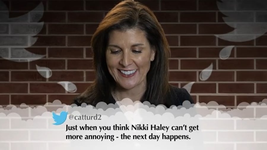 ניקי היילי, המתמודדת מול נשיא ארה"ב לשעבר דונלד טראמפ בפריימריז של המפלגה הרפובליקנית, מפרסמת תיעוד וידאו בו היא מקריאה ציוצים מרושעים, ומגיבה להם בציניות.