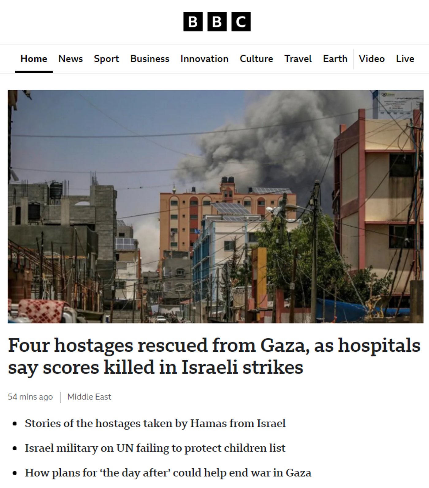 גם ב-BBC נצפתה הידיעה על שחרור החטופים ככתבה ראשית, וכצפוי הכותרת עסקה הן בשחרור והן בפלסטינים שנהרגו במתקפה על נוסייראת: "ארבעה בני ערובה חולצו מעזה, בתי חולים אומרים כי עשרות נהרגו בתקיפה ישראלית".