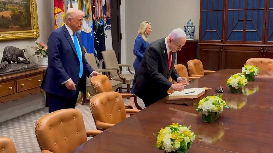 הבית הלבן פרסם סרטון מהרגע בו נכנס ראש הממשלה נתניהו לבית הלבן, ויציאתו של טראמפ לעבר רכבו של ראש הממשלה | בסרטון נראה הנשיא במחווה מיוחדת לנתניהו, מושיב אותו על כסא האורח בזמן שראש הממשלה חותם על ספר האורחים (חדשות, מדיני)