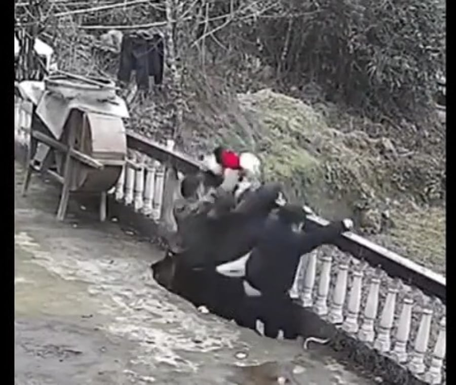 האירוע, שתועד במצלמות אבטחה ב-4 בפברואר 2026, מציג את הרגע שבו הקרקע נשמטת תחת הקבוצה בעודם נשענים על מעקה המרפסת ומביטים החוצה.