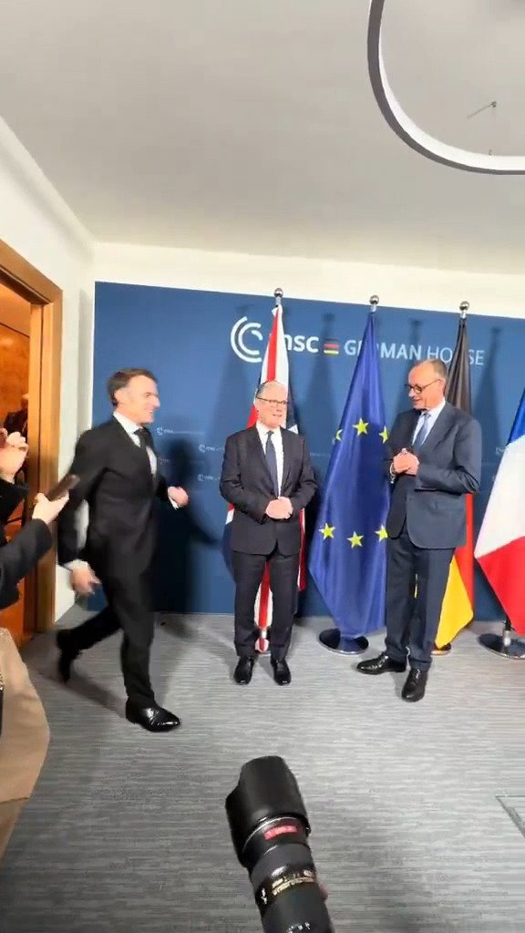 בשולי ועידת מינכן לביטחון שהתקיימה היום (שבת), מנהיגי שלוש המדינות החזקות באירופה (E3), ניגשו לקיר הצילומים כאשר דגלי המדינות מאחוריהם, כנהוג.