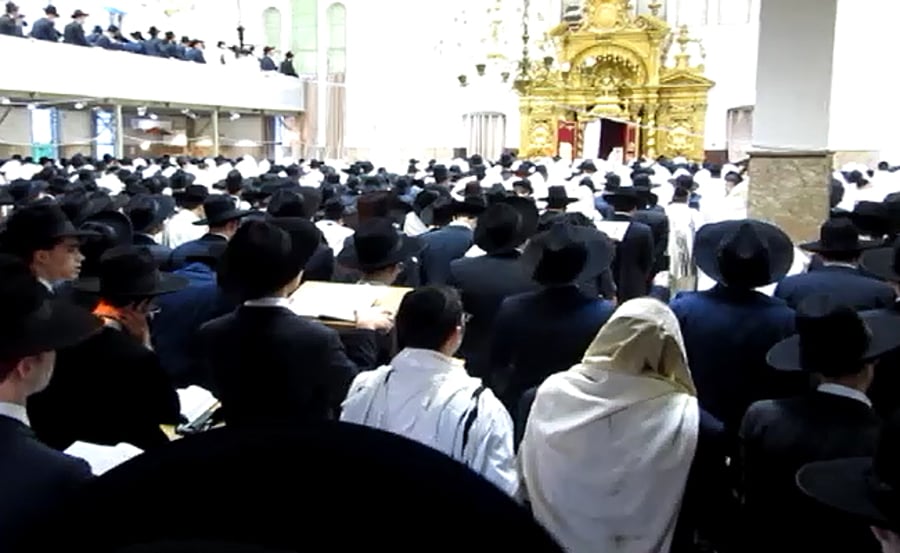 בתיעוד מיוחד נראים תלמידי הישיבה בהיכל ובגלריות לצד ארון הקודש מזהב טהור כאשר לפני התיבה ניגש משגיח הישיבה הגרא"ז גרוסברד ולצידו ראשי הישיבה הגר"ש מרקוביץ והגר"א דויטש.