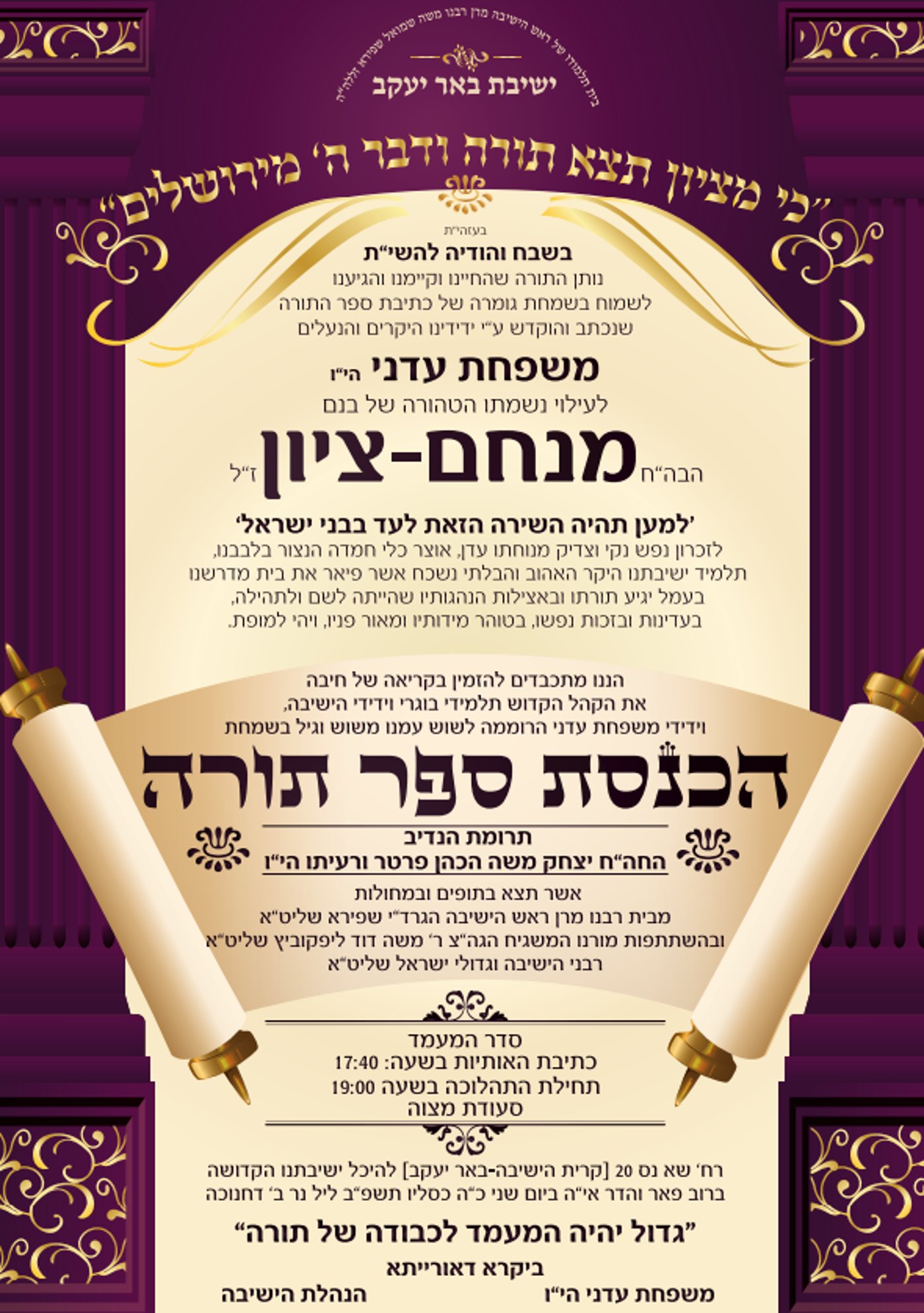 ספר התורה נתרם על ידי הנדיב הרב יצחק משה פרטר ורעייתו, לעילוי נשמתו של הבחור מנחם-ציון עדני ז"ל, שהיה אחד מהמיוחדים בבני החבורה שבישיבת באר יעקב.