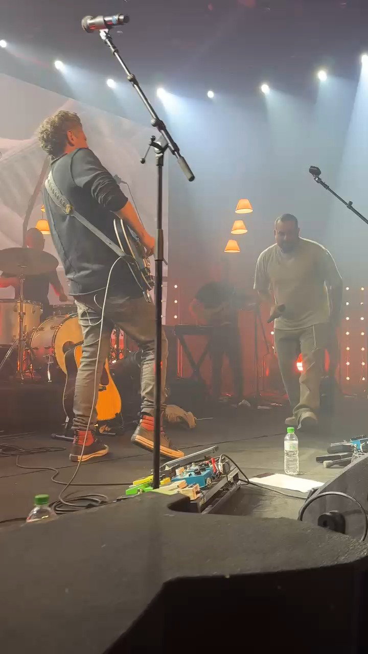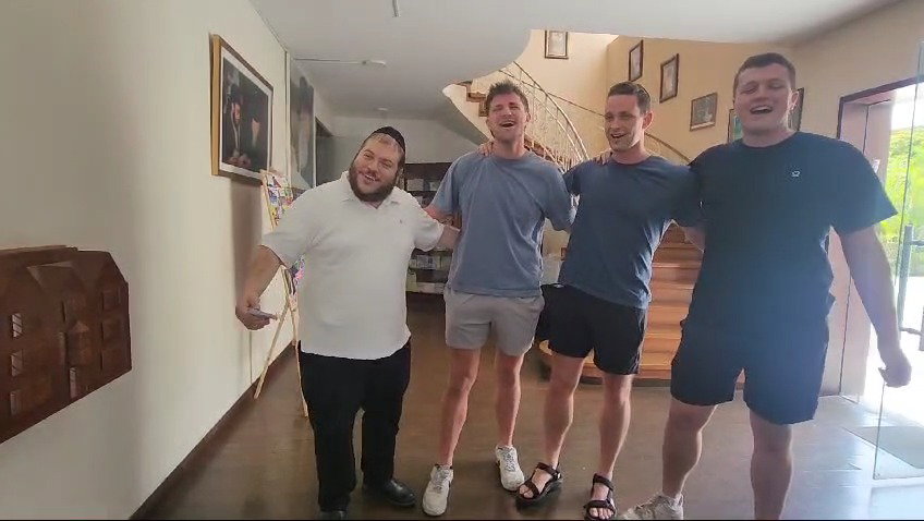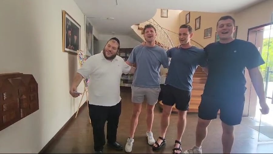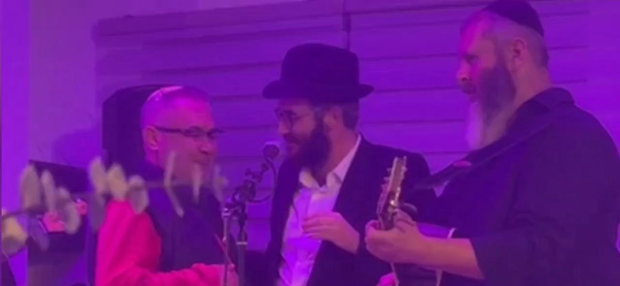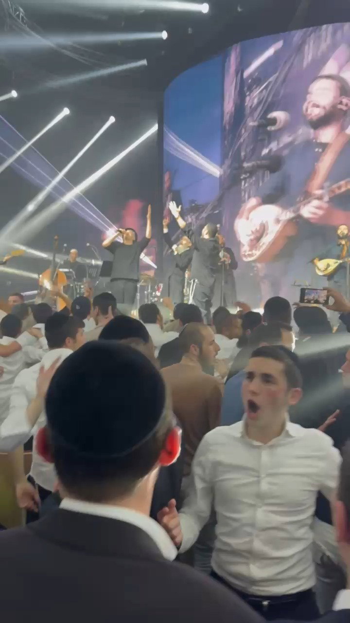 הרב משה שילת מחב"ד והזמרים אברהם פריד, אמיר דדון וישי ריבו, בשירה וריקוד חסידי נלהב מאחורי הקלעים במופעי 'צמאה' ב'בנייני האומה' בירושלים.