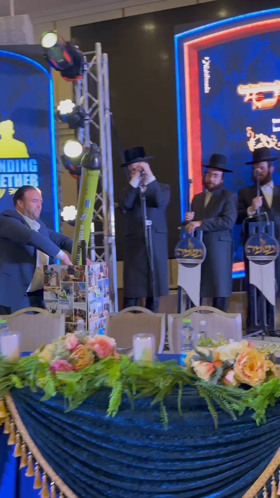 הזמר החסידי בנצי שטיין ומקהלת 'נשמה' בשירי רגש במעמד סיום מסכת קידושין של ארגון 'ביחד ננצח' ועמותת 'כלל ישראל' - שנערך למאות מפוני הדרום במלון 'רמדה' בירושלים, בתיעוד נראה גם המפיק אבי חרל"פ מפתיע את איש החסד שי גראוכר במתנה מקורית לימי המלחמה: "אתה הכיפת ברזל של עם ישראל".