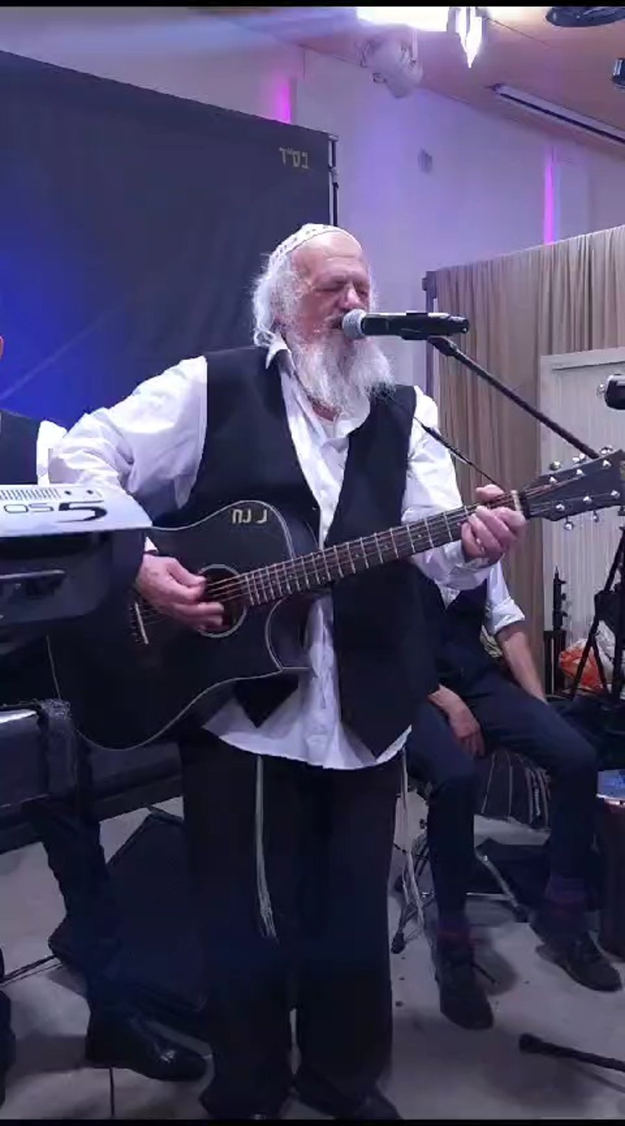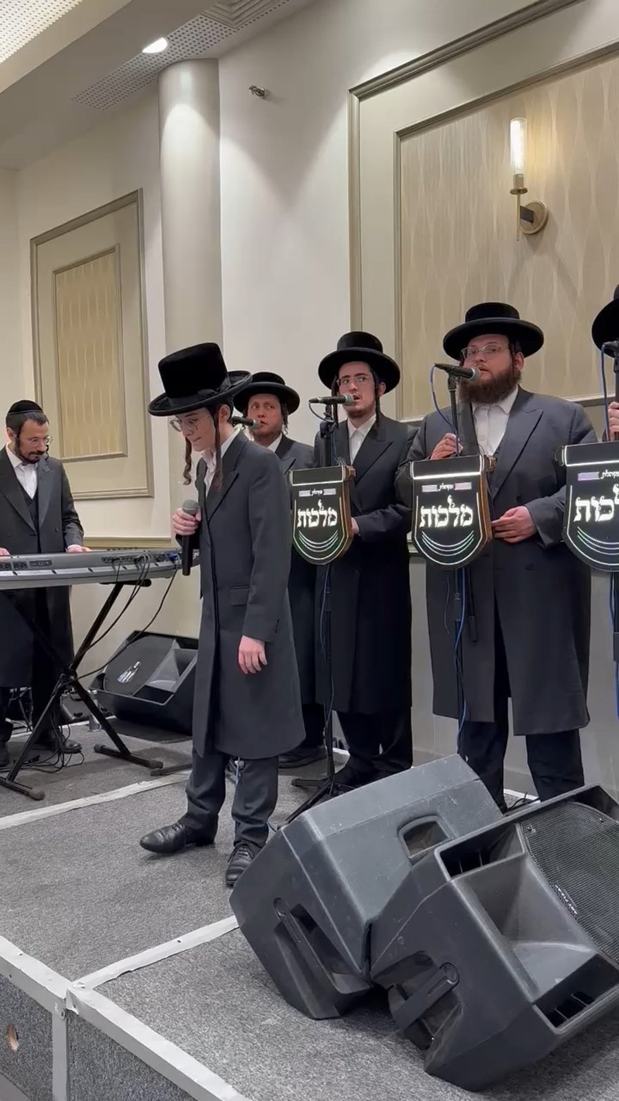נער הפלא בנצי קלצקין, הקלידן חיים בריער ומקהלת 'מלכות' המורחבת בניצוחו של פנחס ביכלר, בשירה בשמחת השבע ברכות לבתו של לייבל פפר מו"ל עיתון 'בקהילה'.
