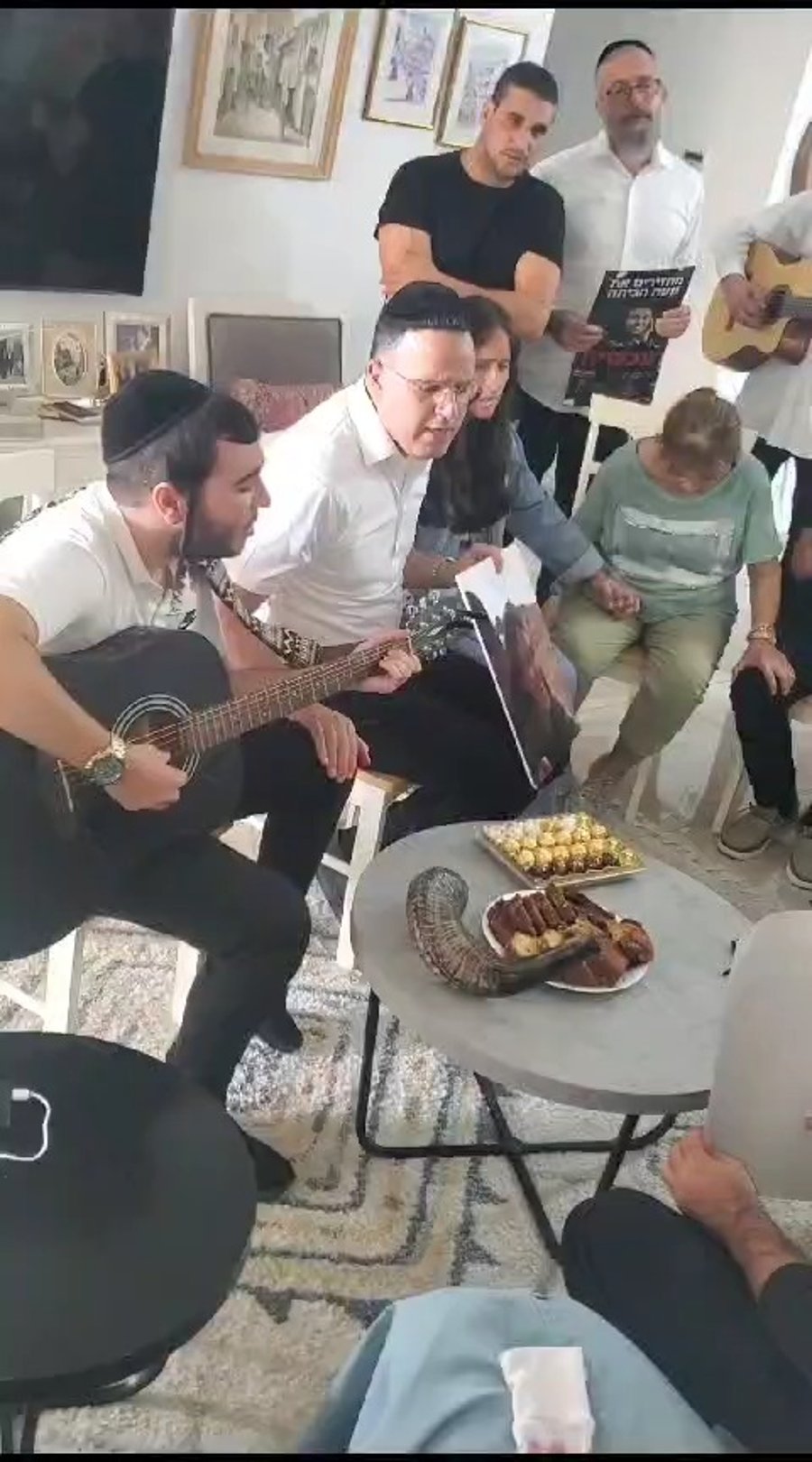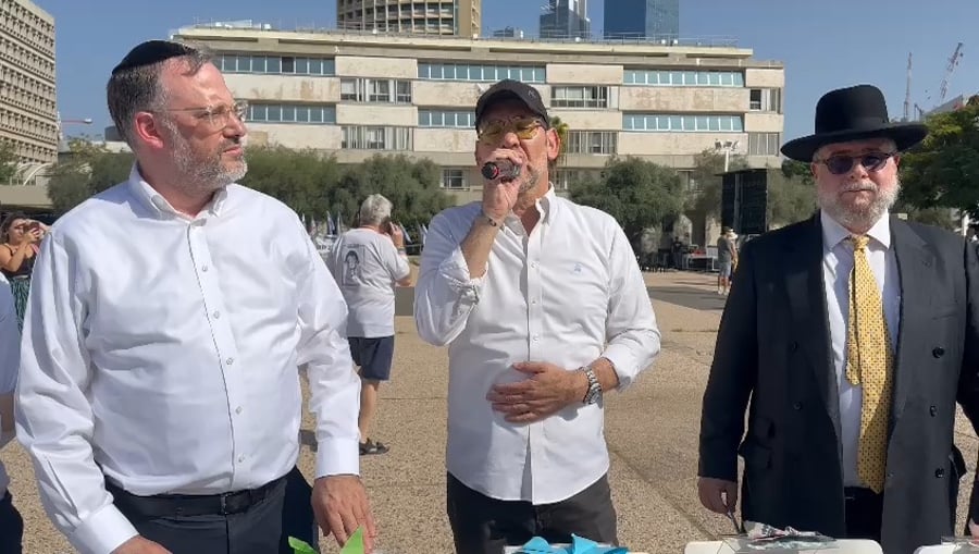 הזמר ישי לפידות ונשיא ועידת רבני אירופה הגאון רבי פנחס גולדשמידט, בשירה מרגשת בקבלת שבת בכיכר החטופים בתל אביב.