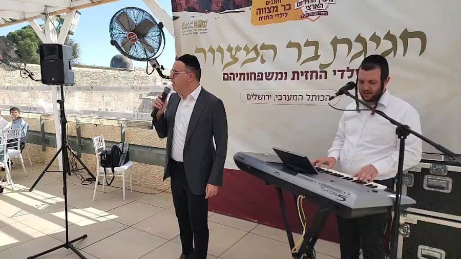 הזמר יעקב שוואקי (כן כן שוב) והקלידן צביקי לוקר משמחים בבר מצווה משותפת שנערכה בכותל המערבי לנערים שפונו מהדרום בעקבות המלחמה.