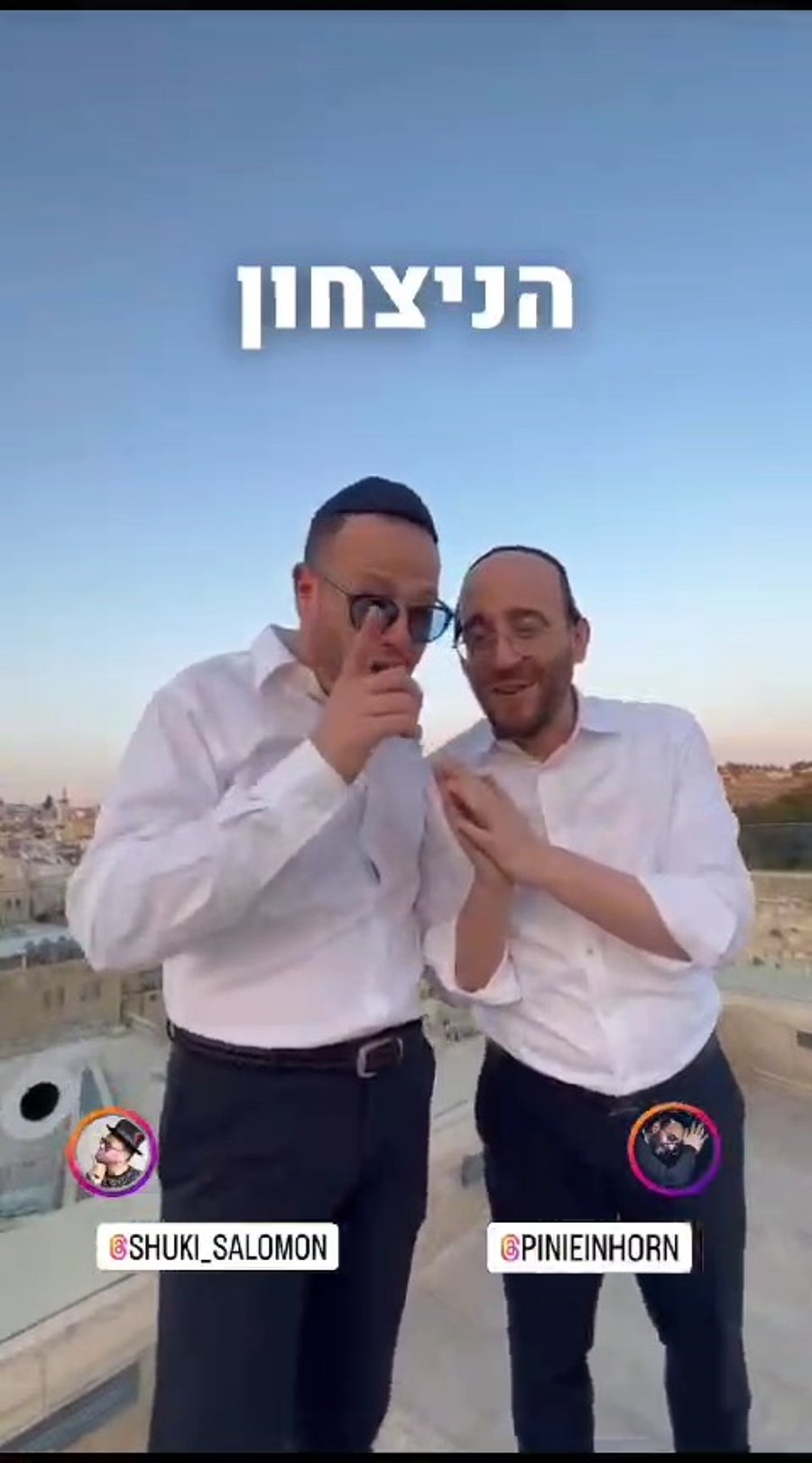 מאחורי הקלעים: כוכב הרשת והזמר והיוצר שוקי סלומון בצילומי קליפ חדש: "שיר הניצחון" יחד עם הזמר פיני איינהורן. על העיבוד הופקד המאסטרו שמוליק ברגר, על הצילום הופקד דוידי נחשון. הקליפ שצולם בין היתר ב'מרכז דוידסון' ובגג ישיבת 'אש התורה' ליד הכותל המערבי, יראה אור במוצאי שבת הקרוב.