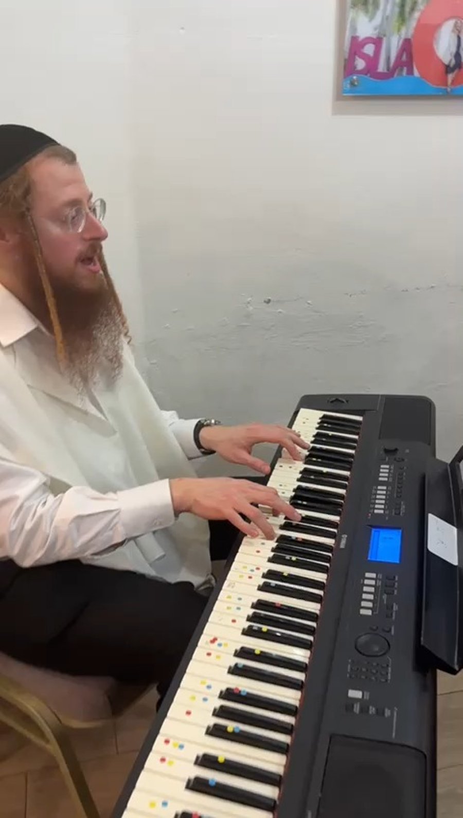 הזמר אברהם מרדכי שוורץ בשירי רגש בבית חב"ד של הרב דודי כפלין בקוזמל שבמקסיקו. 'זינגער' תוהה מה יקרה אם המדבקות הצבעוניות יוסרו מהקלידים...