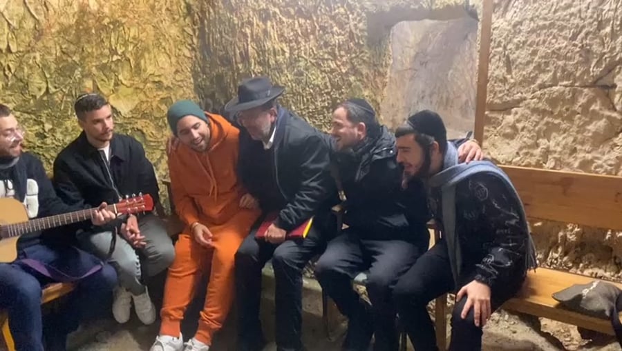 "אבא מלך העולם" • צמד המוזיקאים הישראליים דולי ופן, יחד עם המוזיקאים החרדים שמעון לוי ונחמן זוננשיין - בשירי רגש במערת הסנהדרין ובקבר שמעון הצדיק.
