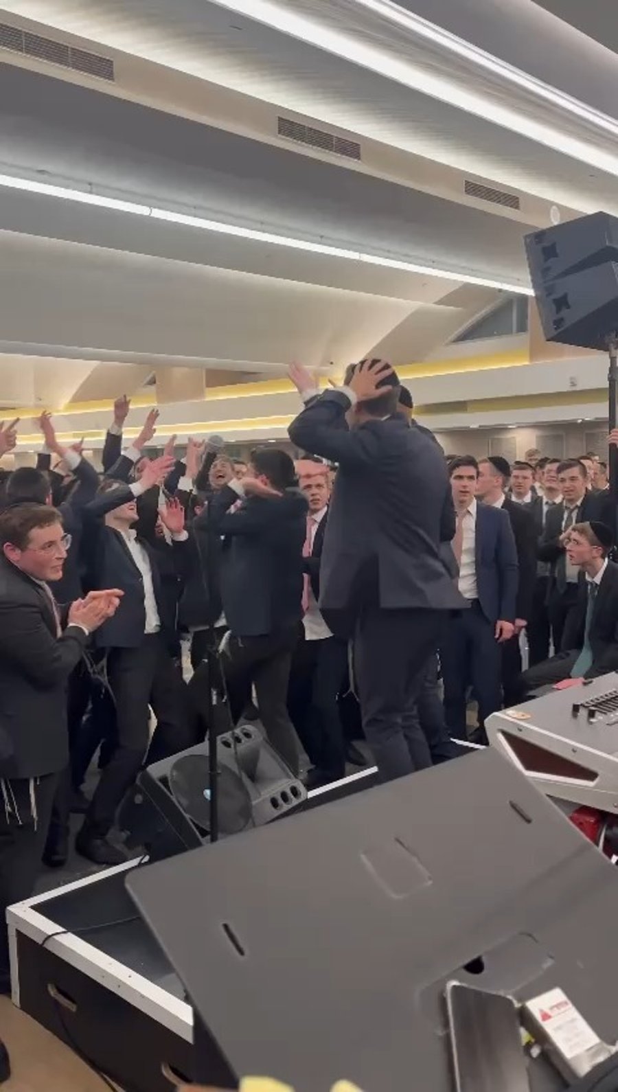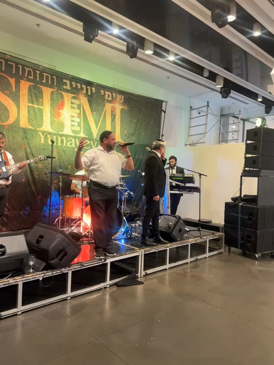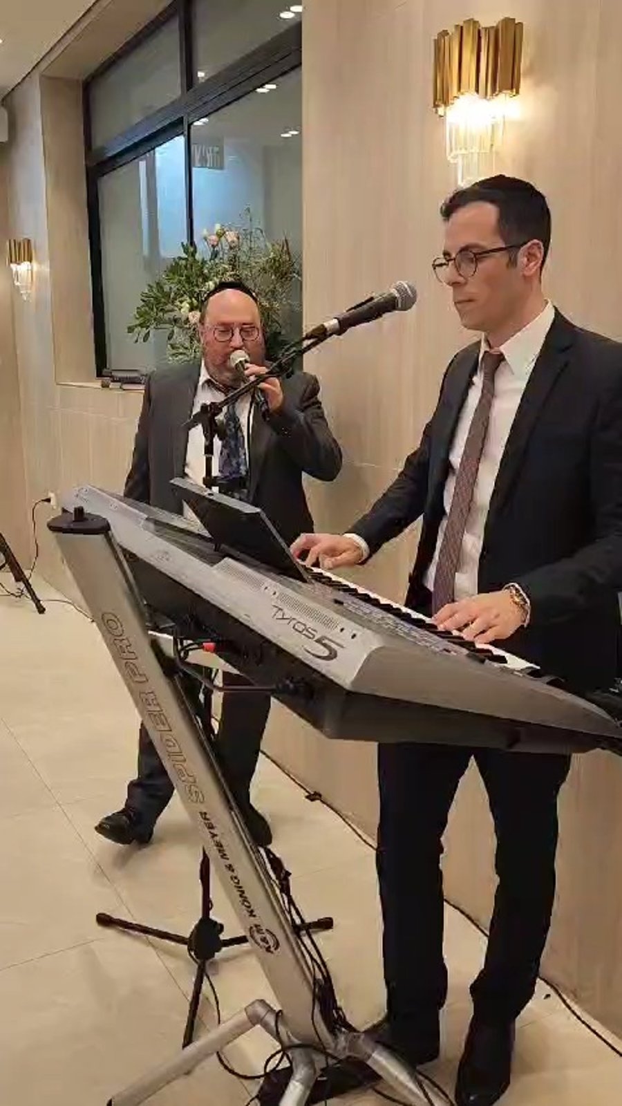 הזמר איציק וינגרטן בסיום מסכת לבחור יתום בישיבת חברון, על המוזיקה הקלידן שמחה אברמצ'יק.