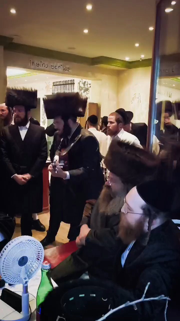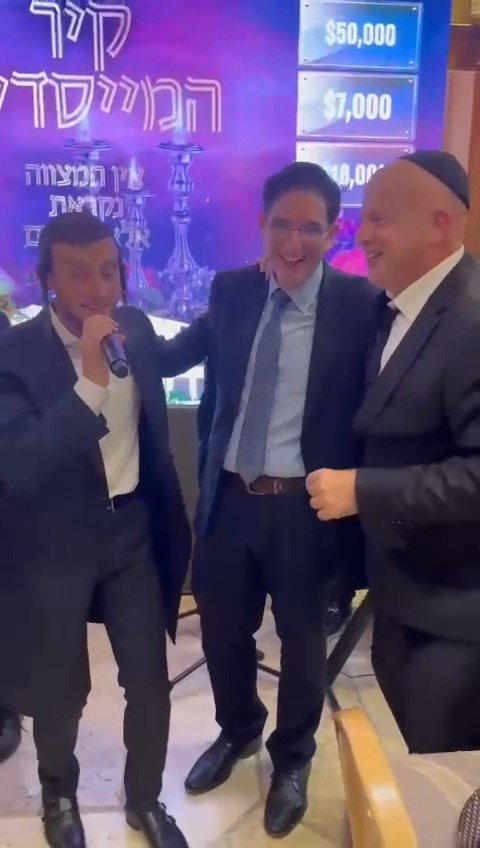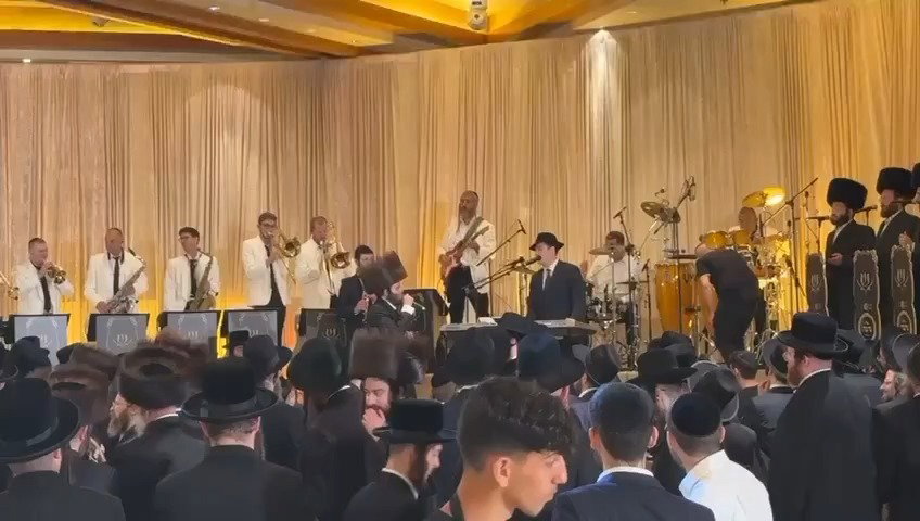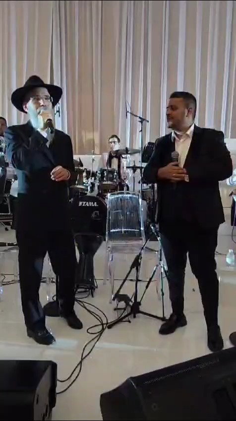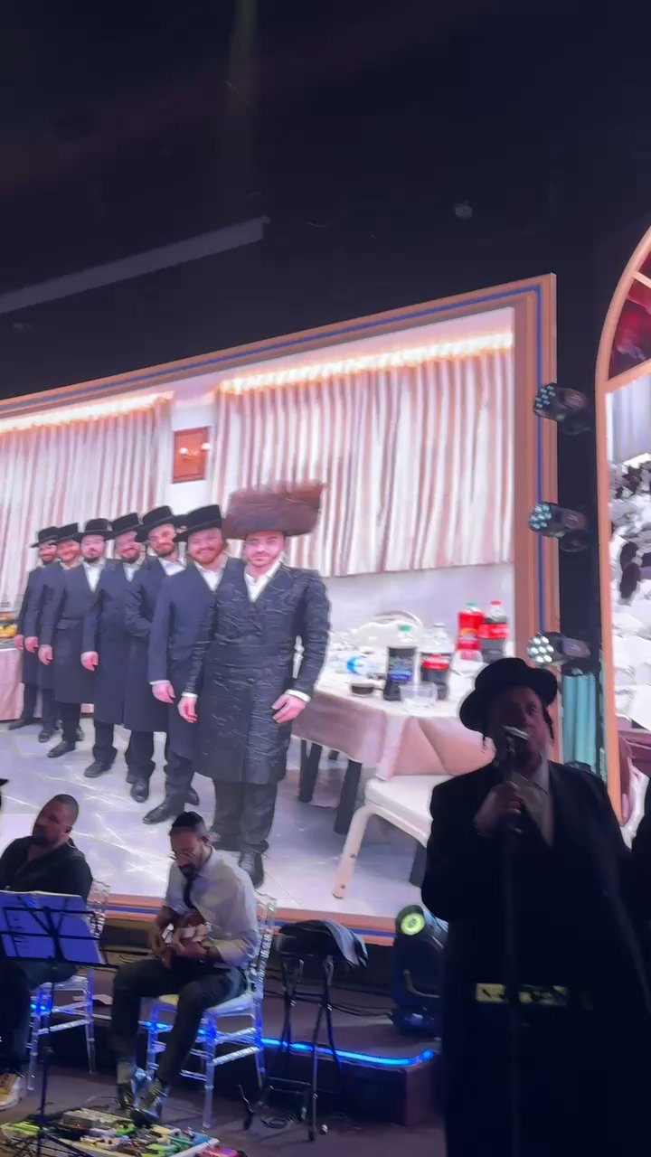 המוזיקאים זאנוויל ויינברגר, יואלי דיקמן, נער הפלא בנצי קלצקין וחברי מקהלת 'נרננה' - משמחים בחתונת בנו של הנגיד שמוליק שפירא מוינה, באולמי 'כתר הרימון'.