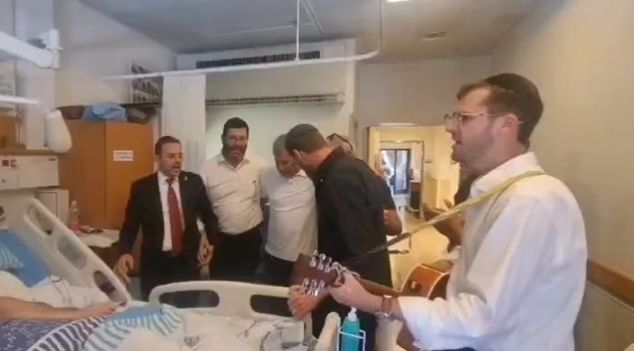 שר הבריאות אוריאל בוסו מש"ס, הזמר יצחק מאיר, יועץ התקשורת ישראל מאיר והעסקן ירון קדושים - משמחים את פצועי המלחמה המאושפזים בבית החולים 'תל השומר'.