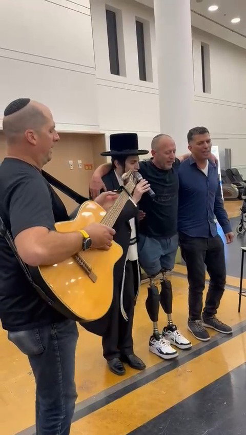 הזמר מוטי שטיינמץ שר ורוקד עם אלישע מידן שנפצע קשה במלחמה בעזה ורגליו נקטעו, במחלקת השיקום בבית חולים 'תל השומר'.