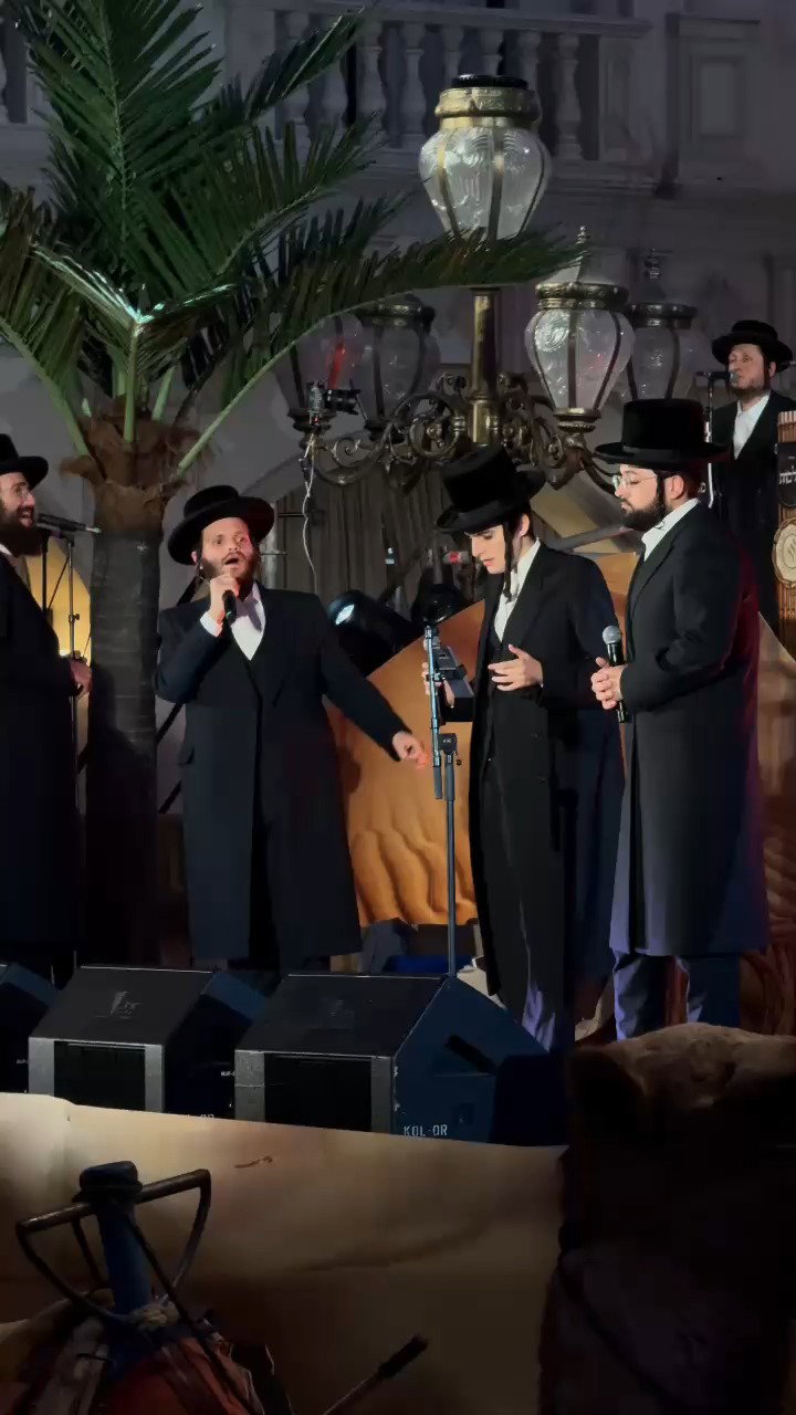 המוזיקאים מוטי שטיינמץ, מוטי ויזל, זאנוויל ויינברגר, בני לאופר, חברי מקהלת 'מלכות' ומקהלת הילדים 'חסידימלעך', בשירה בשמחת השבע ברכות לבנו של הנגיד מנדי רייך ב'דיסיטי'. האירוע שהופק ע"י יחיאל לודמיר עוצב בסטייל של 'אברהם אבינו' במדבר.