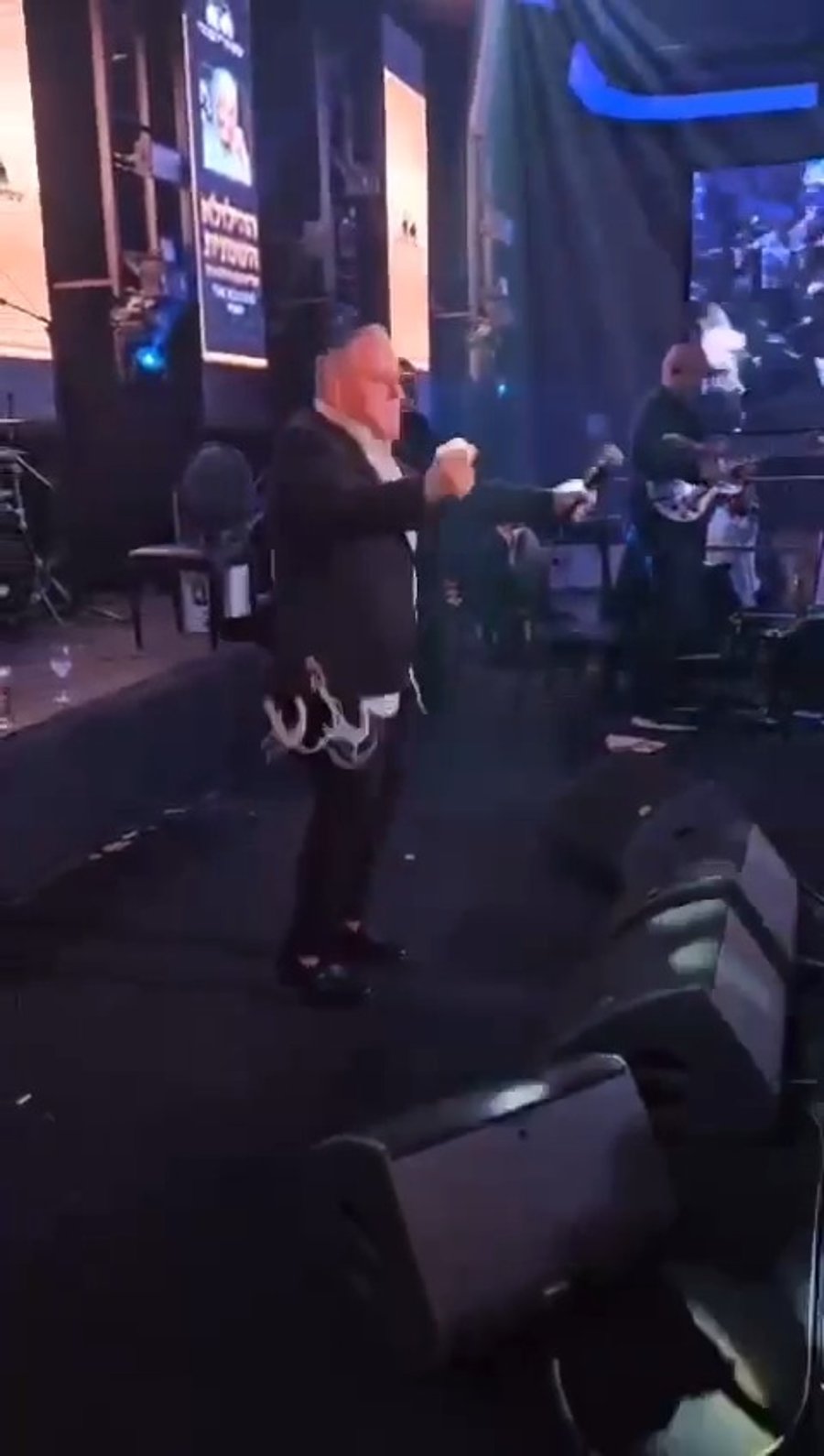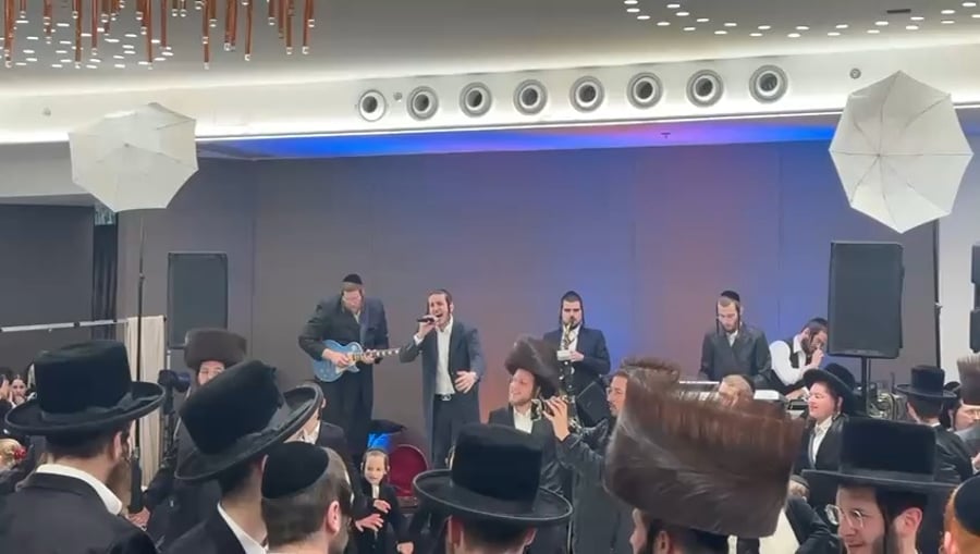 הזמר שמוליק סוכות, מקפיץ בשירת: "כי טוב השם", בחתונת בנו של פישי ויזל מנהל אשכול 'לאומית' בבני ברק, בהשתתפות רבנים, אישי ציבור ואנשי רפואה.