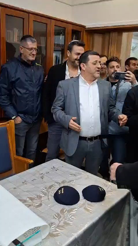 הזמר והפייטן אבי בן ישראל מקבל את האדמו"ר רבי דוד אבחצירא בשירת: "ישמח משה", בכתיבת אותיות בספר תורה במעונו שתרם איש עסקים נודע.