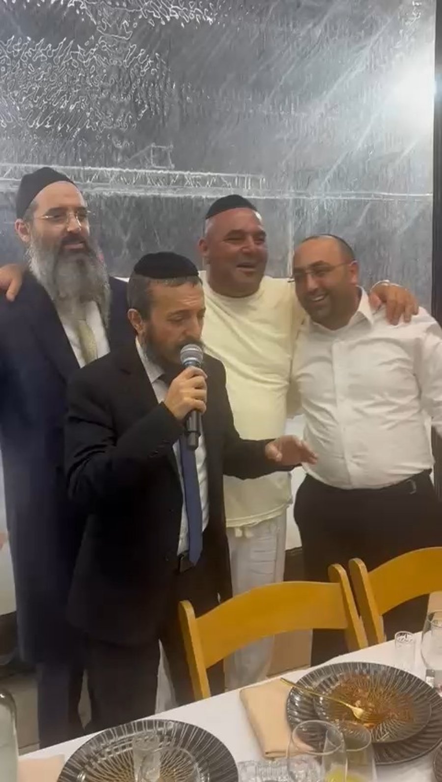 הגאון הרב יצחק אזרחי מראשי ישיבת 'מיר' בשירת: "הטוב כי לא כלו רחמיך" יחד עם הזמרים יונתן רזאל ויואלי דיקמן, בדינר של הישיבה בפריז שבצרפת.
