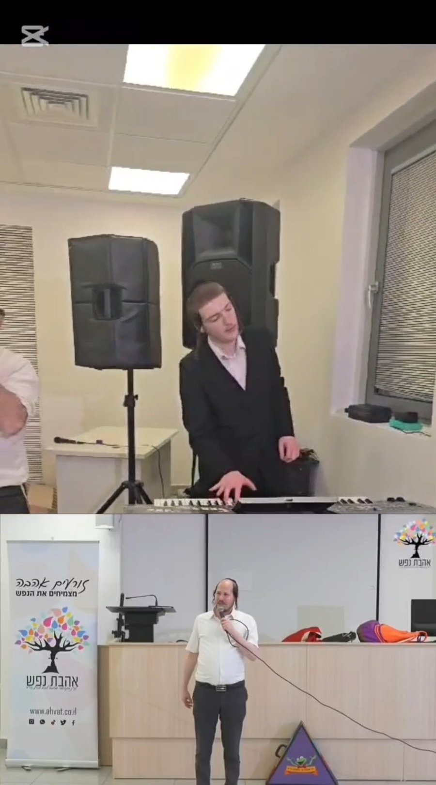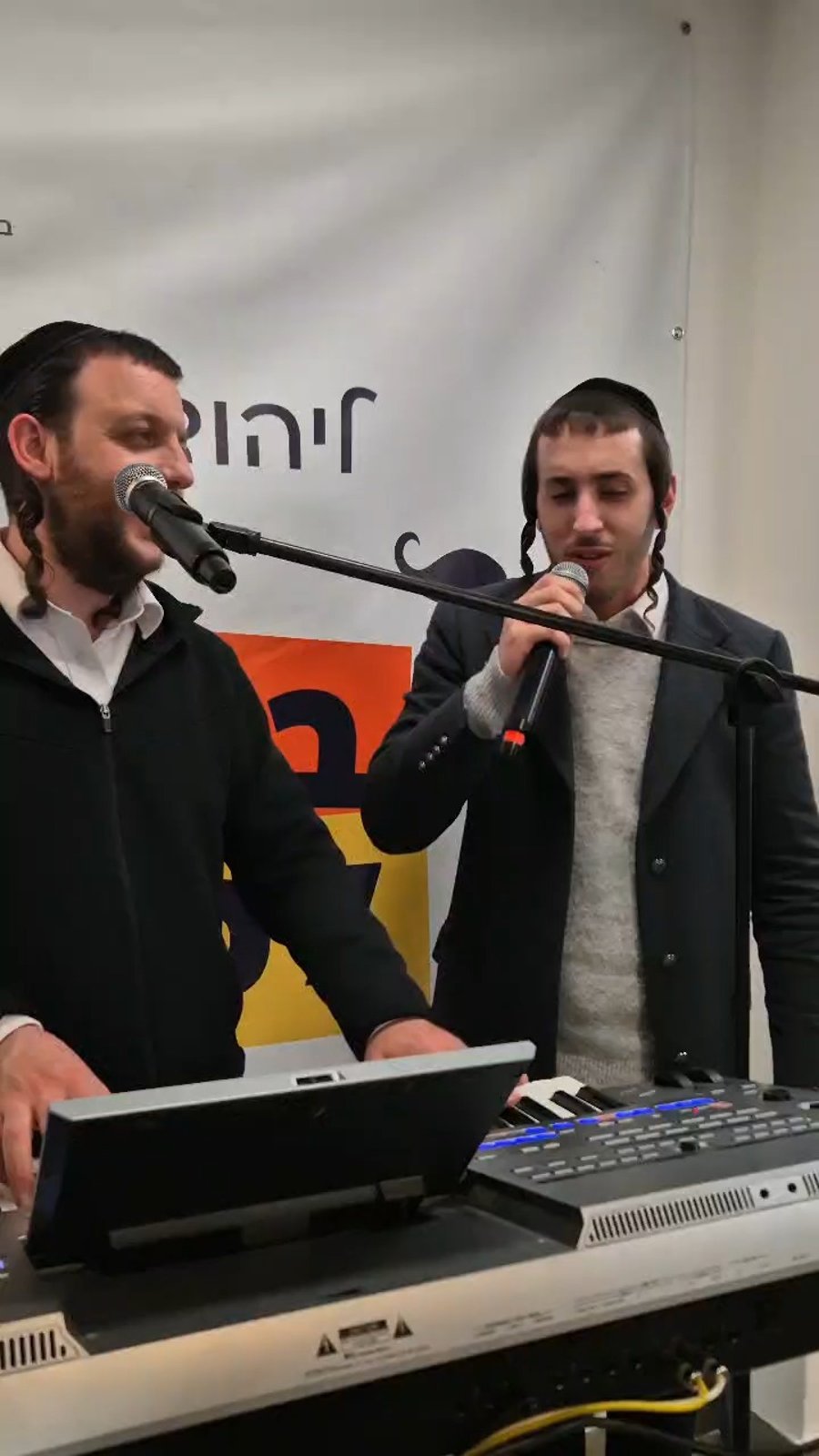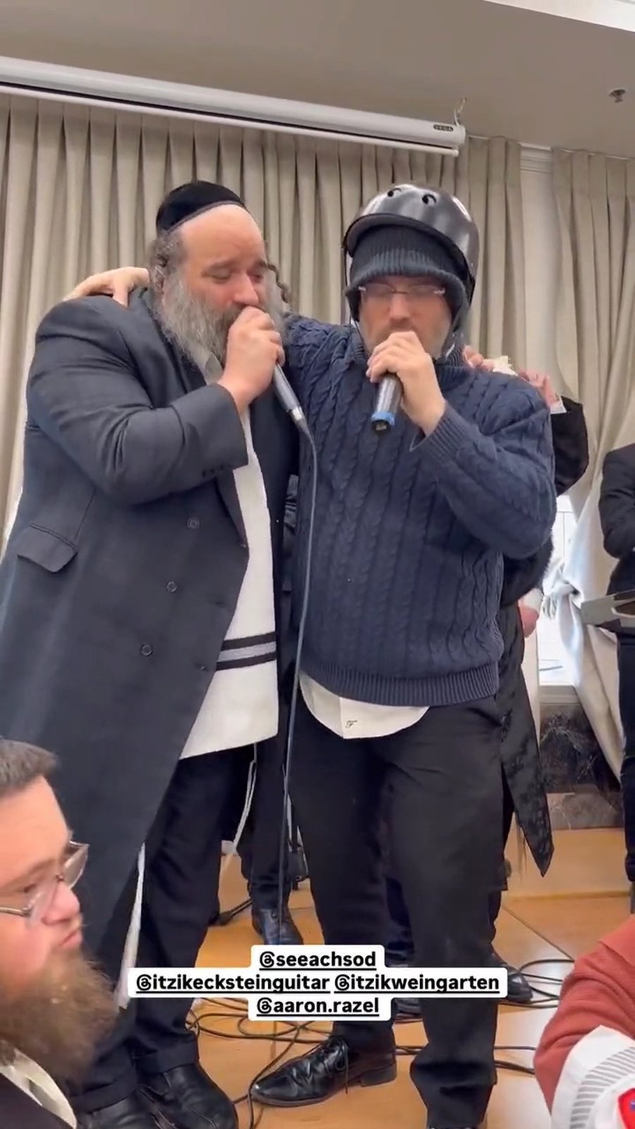 הזמרים אהרון רזאל וקסדת האופניים ויואלי קליין בשירי רגש במסיבת פורים לנערים מיוחדים ב'שיח סוד'.