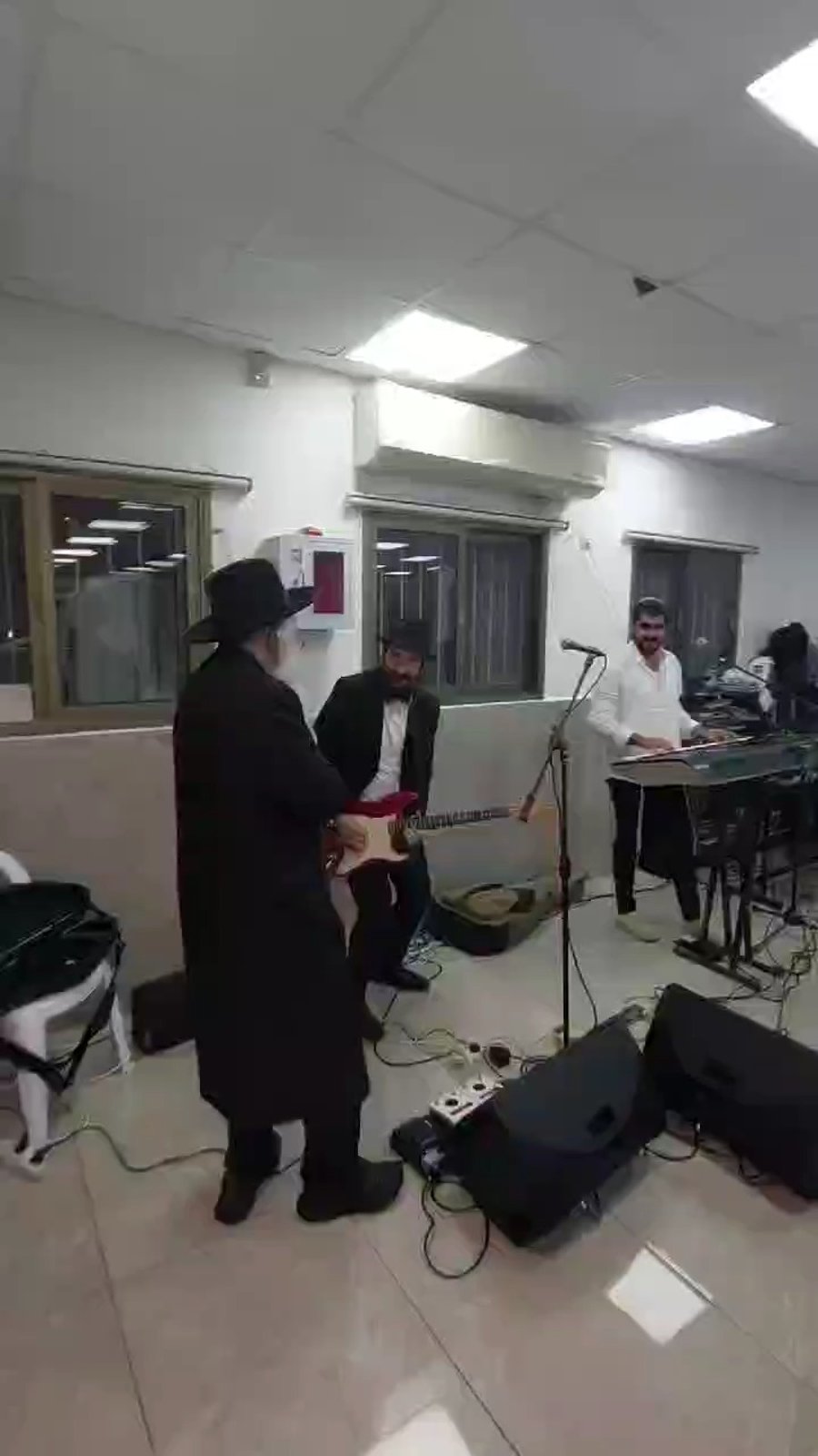 המוזיקאים שמואל גפנר, שימי מנדל ומתניה קמפינסקי יחד עם איש החסד האח החרדי יואל שוורץ יו"ר 'אהבת נפש', משמחים את מתמודדי הנפש במסיבת פורים במחלקת פסיכיאטריה בבית החולים 'מעייני הישועה'.