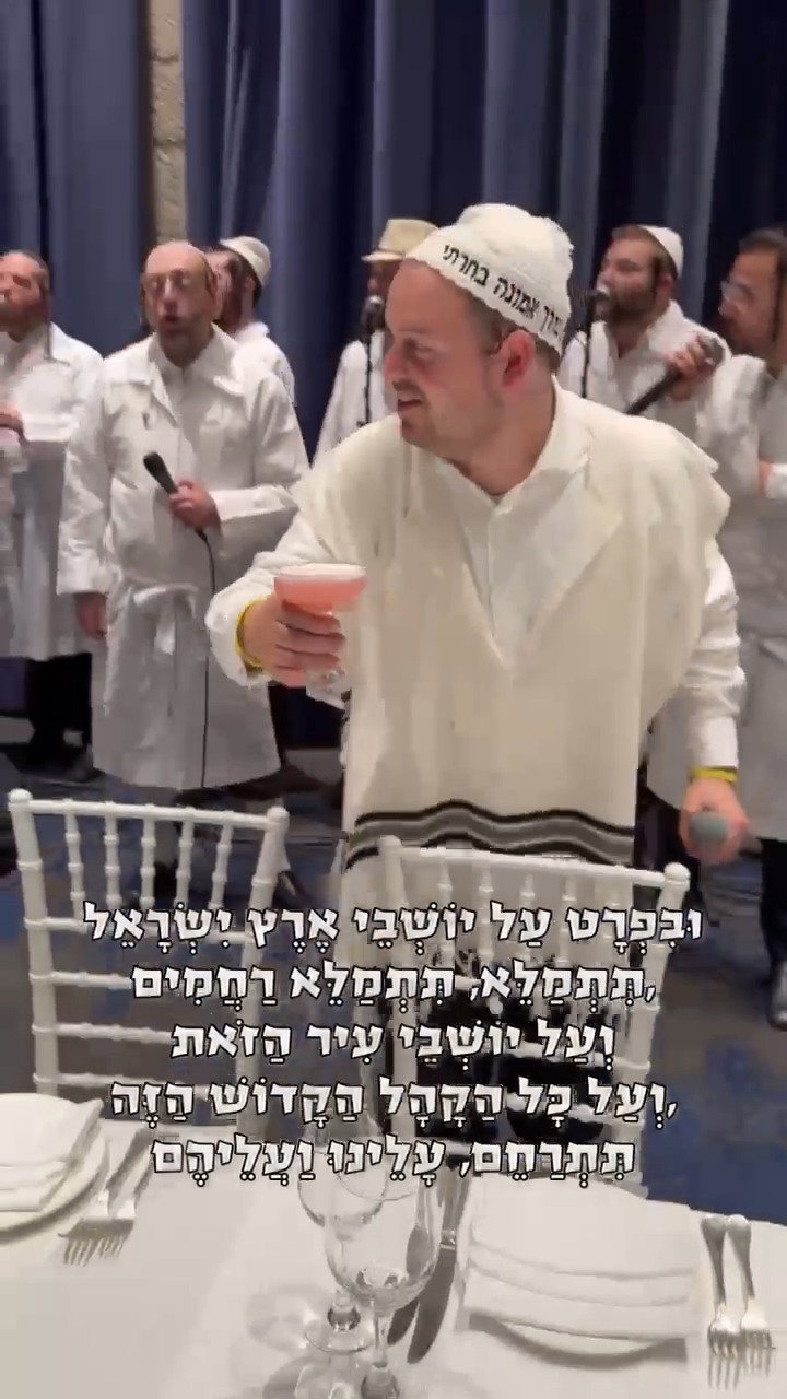 הזמרים אהרל'ה סמט, ארי היל וחברי מקהלת 'נשמה', בשירה מרגשת: "אנא מלך רחום וחנון", עם איש החסד שי גראוכר, במשתה הפורים שערך במלון 'מצודת דוד' בירושלים, בהשתתפות חטופים וחטופות שחזרו משבי חמאס בעזה.