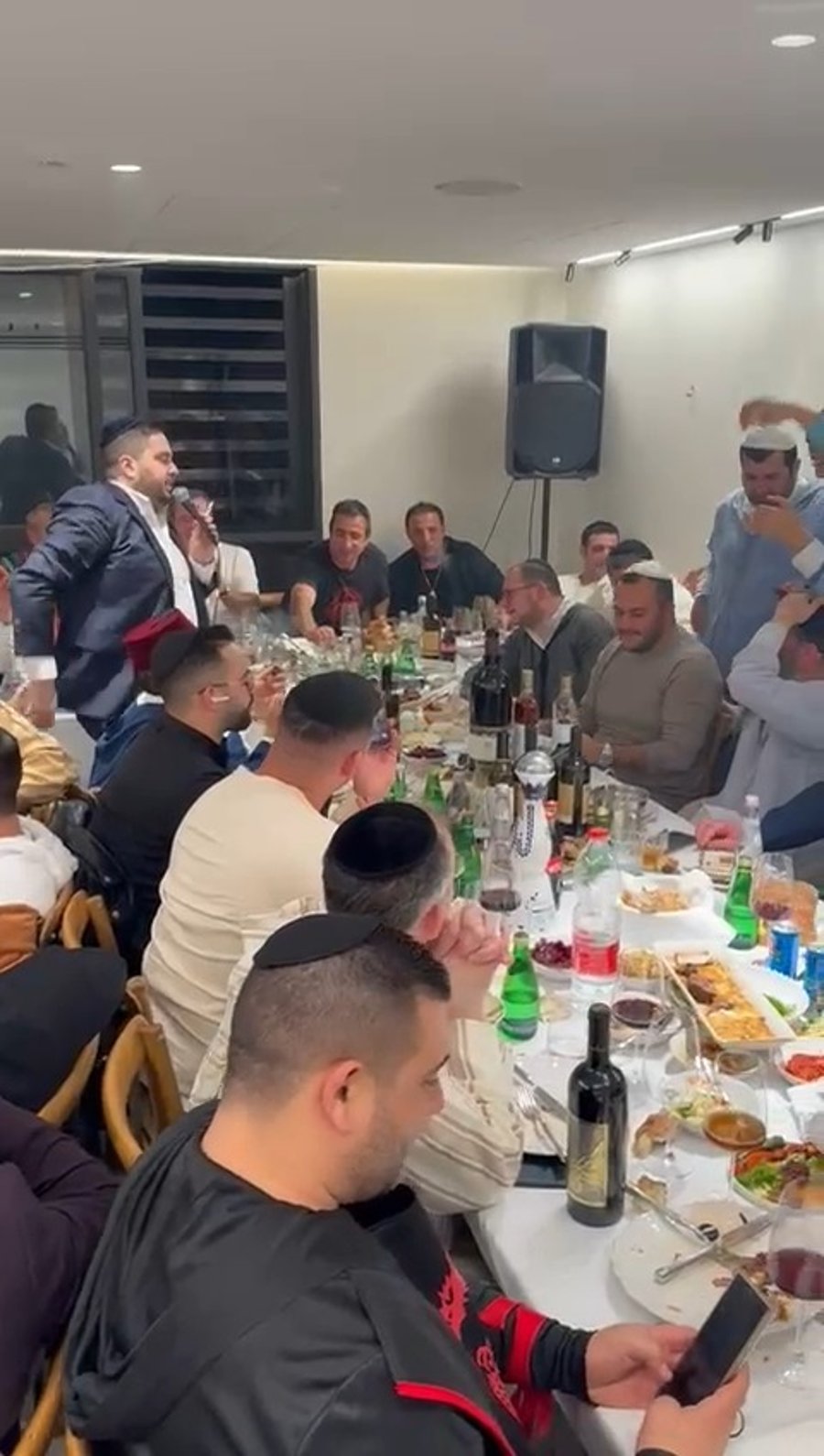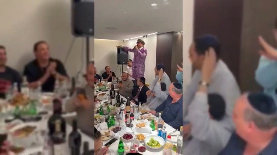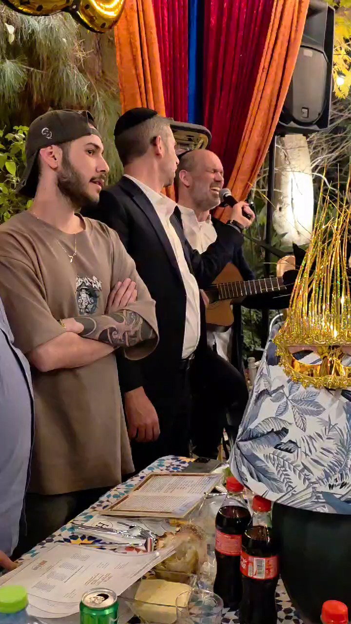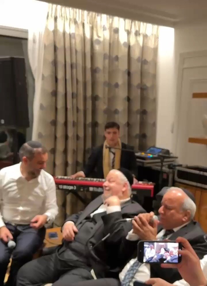 הזמרים והפייטנים משה לוק וגבריאל אוחיון מקפיצים בשירה ופיוט במשתה הפורים בביתו של ברוך נידאם מנהל החטיבה הבינלאומית בזק"א, בהשתתפות רבנים, אישי ציבור ואנשי עסקים.
