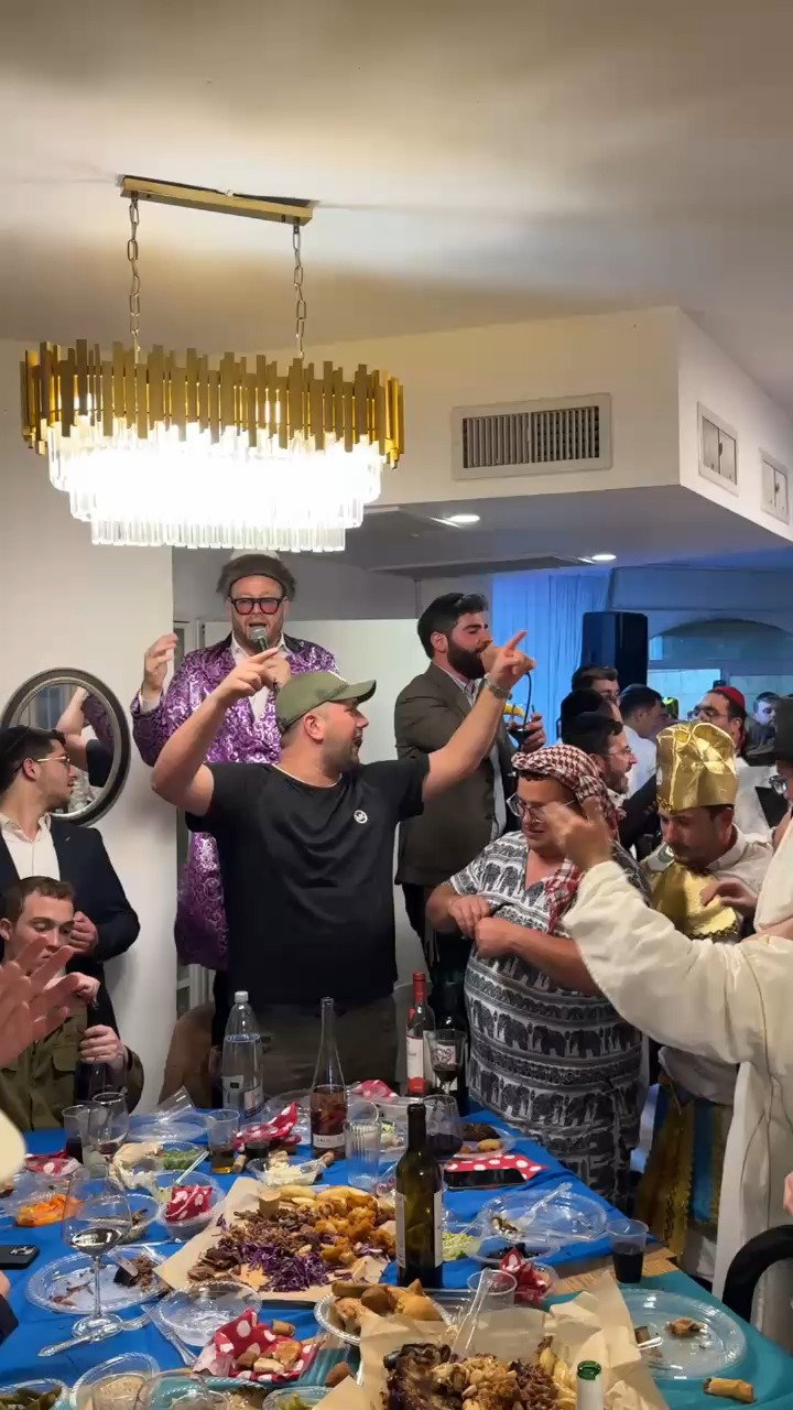 הזמר זאנוויל ויינברגר, המוזיקאי עמי כהן וחברי מקהלת 'מלכות', מקפיצים בשירה במסיבת פורים של הישיבה התיכונית ברמת גן בראשות הרב זיו אור, באולמי 'דימול פלטינום'.