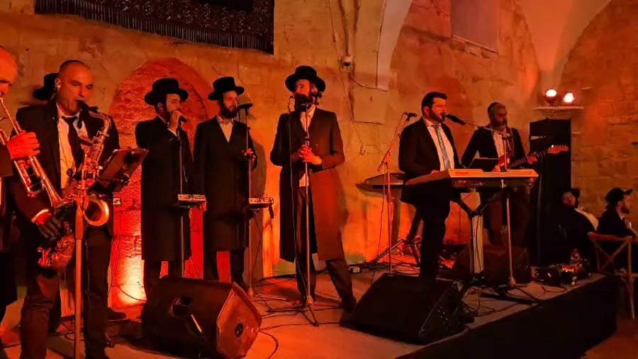 המוזיקאי מוישי רוט וחברי מקהלת 'מלכות', בשירי רגש ביום עיון לרבני 'דרשו' יחד עם נשיא הארגון רבי דוד הופשטטר, מבנה 'החאן האדום' בצפת.