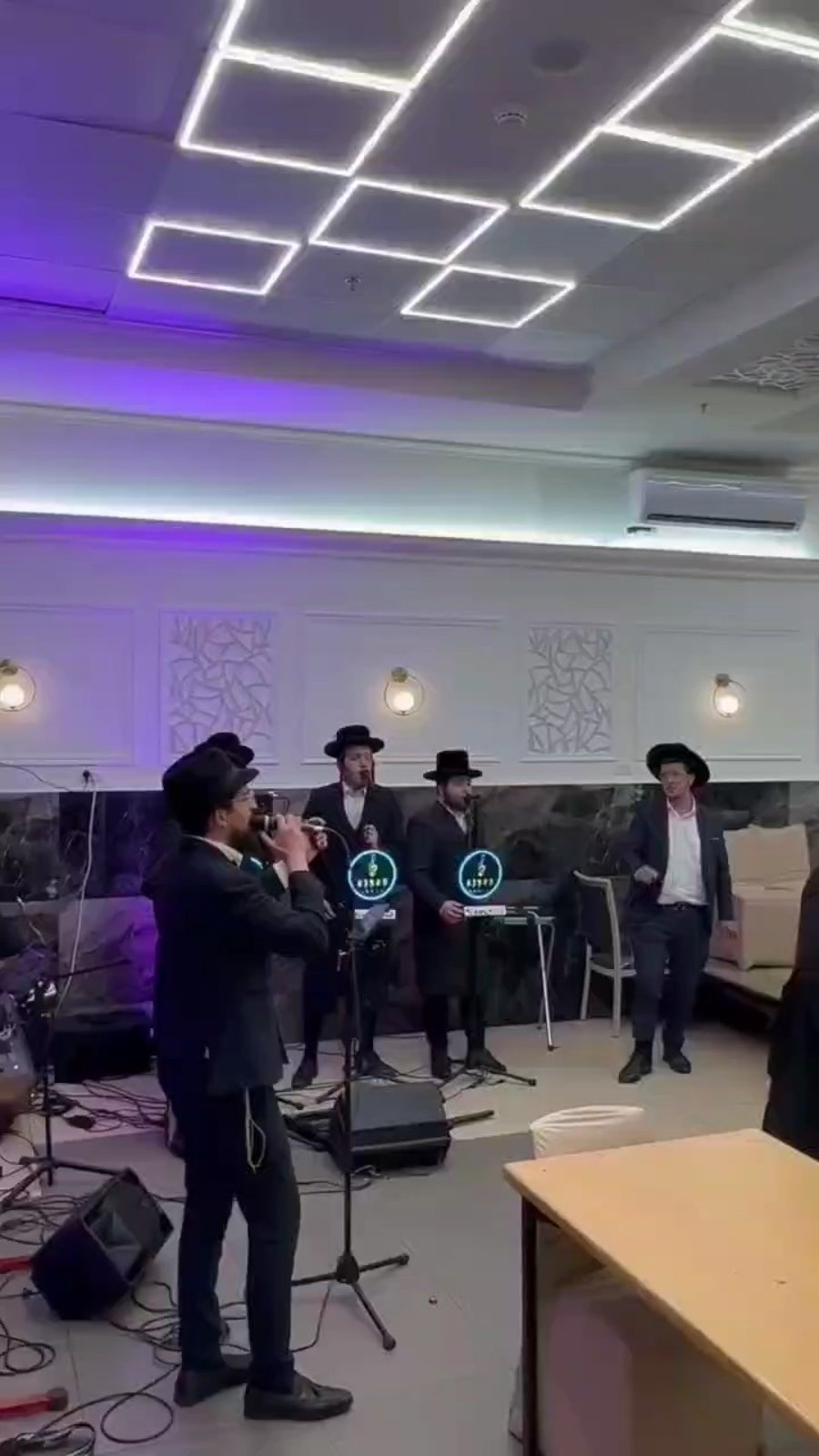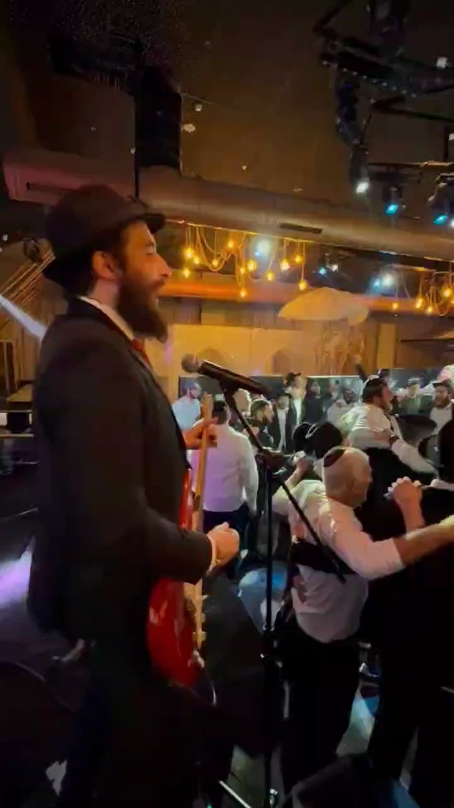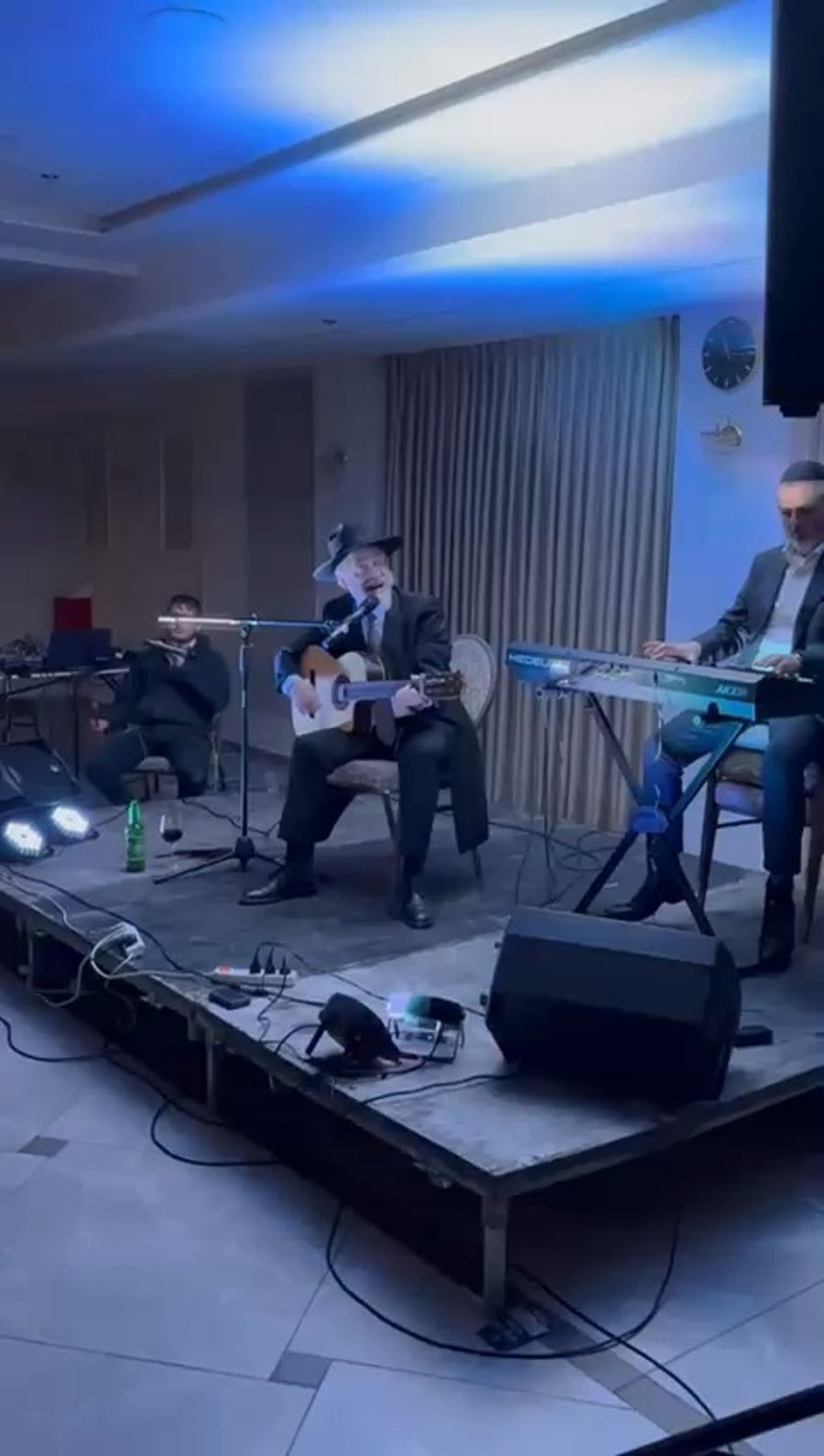 הזמר שימי מלכה - 'שימעל'ה והגיטרה' וחברי מקהלת 'קאפלה', מקפיצים בשירה בשמחת השבע ברכות לנכדת האדמו"ר מפינסק קרלין.